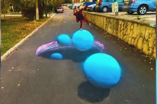 Imagine 15/10/2018 -13:07 News Creația unei pictorițe din Capitală! A realizat, pe asfalt, un impresionant desen 3D care ilustrează niște planete