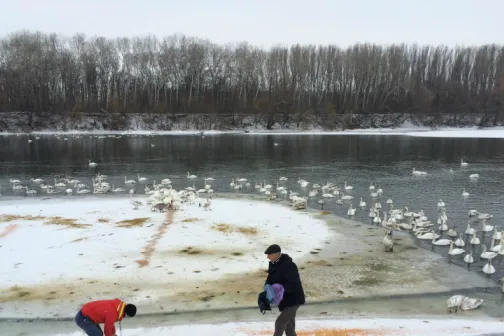 Imagine 29/01/2017 -17:53 Social Imagini rare! Circa 300 de lebede s-au adăpostit pe malul râului Nistru, la Florești