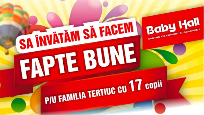 în în colaborare cu postul de televiziune Moldova 1 și Radio Moldova Tineret și cu susținerea Uniunii Nationale a Studenților și Tineretului și a magazinului sportiv adidas au organizat și au petrecut un Targ de caritate unical, unde toți banii adunați au fost readresați familiei lui Lidia și Viorel Tertiuc din s. Nisporeni. Familia ete pe bune una ieșită din comun căci sub un acoperiș trăiesc părinții cu... 17 copii. Cu mare regret, din cauza dificultăților stării de sănătate, părinții nu pot fi angajați la un post de lucru stabil.Din aceste motive, CCA Baby Hall, Moldova 1 și Radio Мoldova Tineret au otganizat primul eveniment inedit – Iarmaroc de Caritate pentru susținerea a familiei Tertiuc.În cadrul evenimentului vedetele televiziunii nationale au expus spre vanzarehainele sale, încălțămintea și bijuteriile pentru a câștiga cât mai mulți bani pentru familia pentyru care a fost organizat întregul eveniment. Iarmarocul a fost suplinit cu un concert de zile mari cu vedtee autohtone care au încins publicul și au dansat împreună cu copii.O mulțime de oameni din toate colțurile țării au venit spre CCA Baby Hall, pentru a aduce pungi cu ajutor material – haine, produse alimentare, încălțăminte, jucării și chiar și o bicicleta. La rândul său magazinul sportiv adidas a adus în dar copiilor o minge originală de fotbal.https://www.youtube.com/watch?v=bCS8J33UgXkSpre finalul evenimentului a fost deschis bolul unde se adunau banii și anunțată suma acumulată. Cu o mare fericire, comisia și-a expus verdictul – 17 000 lei. Exact aceasta sumă va fi transmisă familiei Tertiuc din s.Nisporeni.CCA Baby Hall aduce sincerele mulțumiri postului de televiziune Moldova 1și Radio moldova Tineret pentru susținerea în organizarea unui eveniment atât de important și nobil. Suntem convinși că resursele acumulate vor fi un ajutor enorm familiei Tertiuc, căci numai cu forțe comune noi vomputea dărui ajutor, speranță și fericire celor care într-adevăr au nevoie.Haideți să învățăm să facem fapte bune.