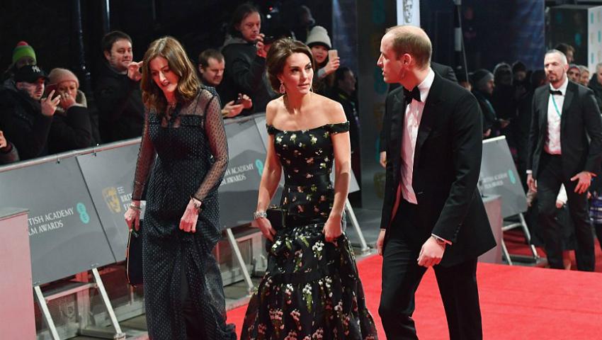 Kate Middleton și Prințul William au participat pentru prima dată la Premiile BAFTA. Cu acestă ocazie Ducesa de Cambridge a ales să îmbrace o rochie creată de Alexander McQueen cu talie joasă de culoare neagră și cu imprimeuri florale. Ținuta splendidă i-a lasat umerii la vedere și i-a scos în evideță talia de viespe. Kate și-a accesorizat rochia cu o pereche de cercei candelabru și cu o manșetă din diamant.