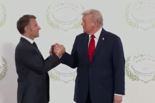 Imagine 14/10/2025 -00:30 Știri externe Strângere de mână neobișnuită între Donald Trump și Emmanuel Macron la summitul pentru Gaza din Egipt: momentul a devenit viral pe rețelele sociale