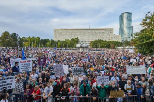 Imagine 17/09/2025 -08:34 Știri externe Mii de slovaci au ieșit în stradă împotriva austerității lui Robert Fico: „Ajunge! Ne-am săturat!” Proteste în 16 orașe, apeluri la grevă generală