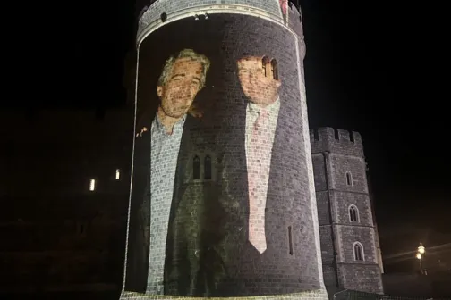 Imagine 17/09/2025 -07:01 Știri externe Imagini cu Donald Trump și Jeffrey Epstein proiectate pe un turn al Castelului Windsor, înainte de vizita președintelui SUA la Londra