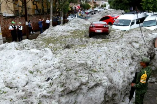 Imagine 01/07/2019 -08:37 News Strat de gheață de 1,5m pe străzile unui oraș mexican, după o furtună cu grindină
