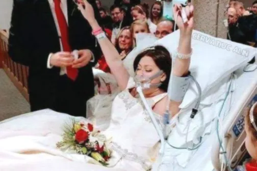 Imagine 14/03/2019 -14:57 News O femeie care suferea de cancer a îmbrăcat rochia de mireasă pe patul de spital