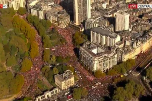 Imagine 20/10/2018 -21:39 News Manifestație uriaşă la Londra. O jumătate de milion de britanici au ieşit pe străzi, cerând încă un referendum pe Brexit
