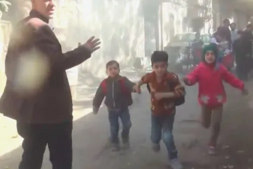 Imagine 31/10/2017 -09:52 News Mai mulți copii plâng și aleargă înfricoșați în timpul unui bombardament, la o grădiniță
