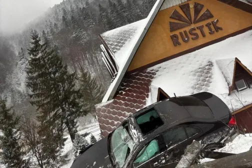 Imagine 08/01/2026 -20:07 Știri externe Accident spectaculos la Predeal: o mașină a rămas blocată pe acoperișul unei pensiuni. Șoferul, rănit și transportat la spital