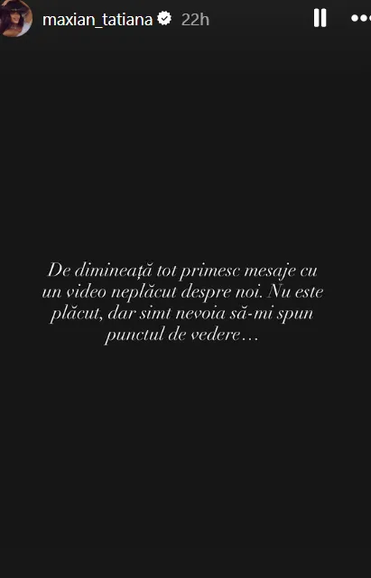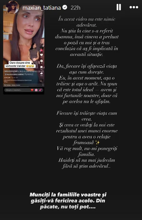 Fără să ofere nume, comunitatea online a presupus că ar fi vorba despre Tatiana Maxian, cunoscută pentru prezența sa activă pe rețele și pentru relația expusă frecvent alături de soțul său.