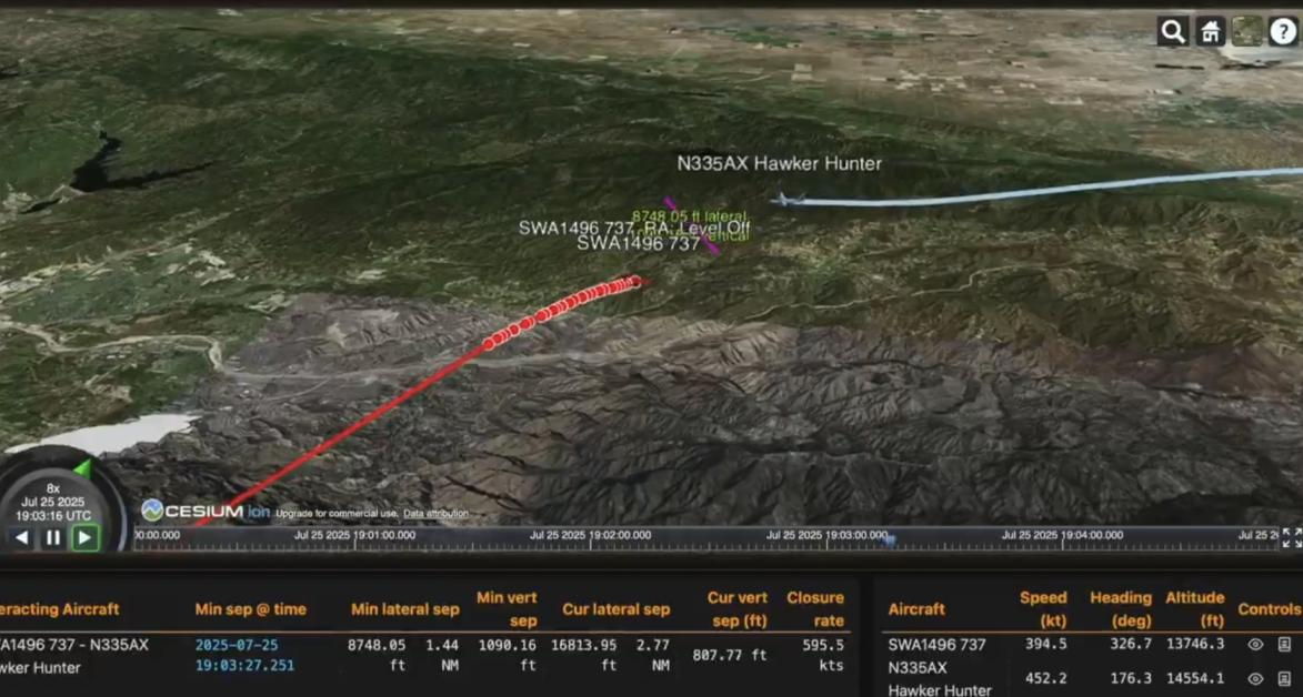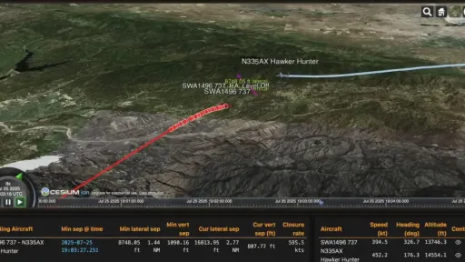 Avionul a evitat o coliziune cu un avion Hawker Hunter, înregistrat în prezent la o Corporație Non-Cetățean, conform registrelor de înregistrare FAA, potrivit The Guardian.