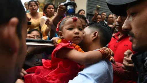 Purtând o rochie roșie, noua "Kumari" — considerată încarnarea zeiței hinduse Taleju — a fost luată din casa familiei sale și plimbată într-o procesiune până în piața Durbar, o piață istorică din Kathmandu, capitala Nepalului în care mai pot fi încă văzute urmele seismului devastator din 2015.