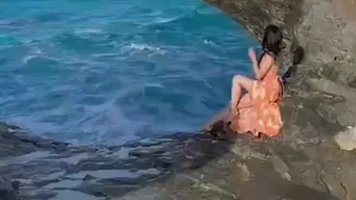 Imaginile arată cum femeia, îmbrăcată într-o rochie portocalie de vară, stătea pe marginea unei stânci, foarte aproape de apă. Un val uriaș s-a ridicat brusc în spatele ei, a lovit stânca și a doborât-o, târând-o în largul mării.
