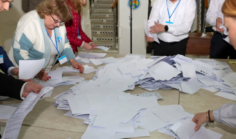 Membrii unei comisii electorale numără voturile după închiderea secțiilor de votare în timpul alegerilor prezidențiale din Moldova și a referendumului privind aderarea la Uniunea Europeană, Chișinău, 20 octombrie, scrie moldova.europalibera.org.