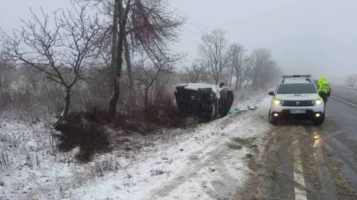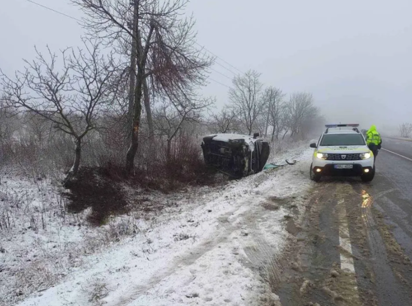 Oamenii legii au stabilit preliminar că șoferul de 62 de ani a pierdut controlul volanului din cauza condițiilor climaterice și s-a răsturnat.