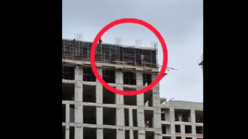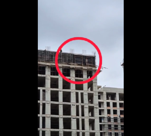 La ultimul etaj, al 12-lea, al unei clădiri aflate în construcție în prezent, un muncitor a fost surprins cum urcă pe o scară din lemn în exteriorul clădirii fără nicio plasă de siguranță.