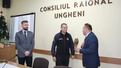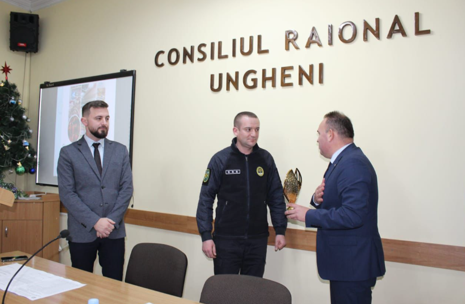 Agent-șef principal Denis Cebotari s-a învrednicit de o diplomă și un trofeu din partea Consiliului raional Ungheni pentru curajul, bărbăția și spiritul de sacrificiu, manifestate în timpul intervenției.