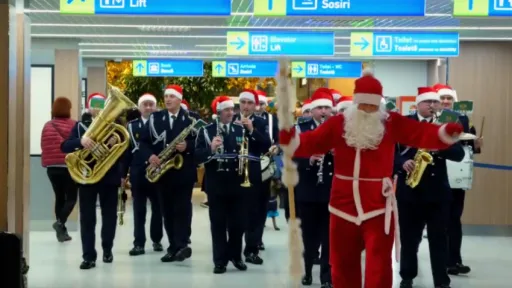 Fanfara Poliției de Frontieră i-a surprins plăcut pe călătorii Aeroportul Internațional Chișinău. Cu ocazia sărbătorilor, instrumentiștii fanfarei au interpretat cântece și urături pentru cei sosiți în țară.