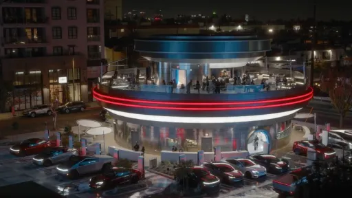 Printre atracțiile inedite se numără roboții Optimus care servesc popcorn, toalete inspirate de interiorul unei nave spațiale, recipiente de mâncare în formă de Cybertruck și două ecrane LED de 20 de metri unde rulează filme pentru clienții care își încarcă vehiculul.