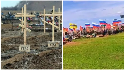 Numărul mare de morminte ale soldaților ruși poate fi observat după steagurile militare rusești, coroane și simbolul ”Z”.