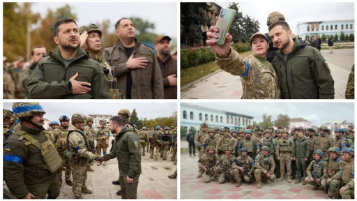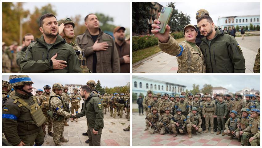 Fotografiile de pe pagină de Facebook a unei unități a armatei îl arată pe Zelenski la o ceremonie în piață principala pentru a ridică steagul ucrainean deasupra clădirii administrative a orașului. Hanna Maliar, ministrul adjunct al apărării, a fost, de asemenea, prezența.