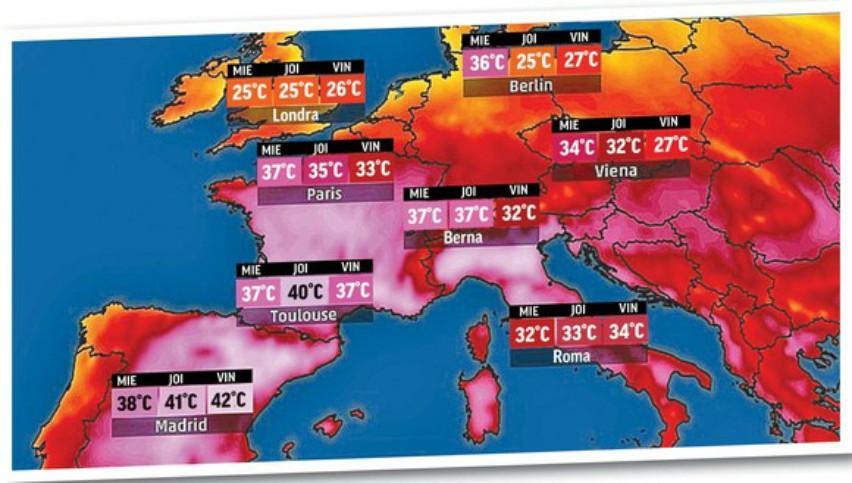 Meteorologii din Franţa, Spania, Germania, Belgia, Austria, Grecia, Ungaria, Serbia, Bulgaria şi România au emis deja avertismente de căldură şi recomandă să evităm, pe cât posibil, să ieşim din case şi să ne hidratăm corespunzător.Iată cu ce temperaturi extreme se confruntă bătrânul continent în aceste trei zile:În România, meteorologii au prognozat pentru astăzi temperaturi de peste 35 de grade la umbră în tot sudul ţării, iar pentru Lunca Dunării 36 de grade, posibil mai mult. Atenţie! Aceste valori sunt măsurate la umbră, iar cele din aer vor fi peste 40 de grade. Indicele de risc pentru razele ultraviolete a ajuns la nivelele 7 -8, ceea ce înseamnă că pielea se va înroşi după 30 de minute de expunere la soare.Meteorologii avertizează că temperaturile vor atinge cote alarmante cuprinse între 35 şi 40 de grade Celsius începând de miercuri şi până vineri.La Madrid, sunt anunţate pentru joi şi vineri temperaturi insuportabile, iar meteorologii susţin că termometrele pot înregistra la soare temperaturi criminale de 47 de grade Celsius.Portugalia. Deşi nu se confruntă cu temperaturi ridicate, portughezii au fost surprinşi marţi să descopere că străzile, casele şi maşinile au fost acoperite de un praf roşiatic provenit din deşert.Serbia. Autorităţile sârbe au avertizat că termometrele vor indica 34-35 de grade Celsius joi, iar pe perioada nopţii temperaturile vor fi de 20-22 de grade Celsius.Germania. Autorităţile vor să impună restricţii privind munca în aer liber, după ce meteorologii au anunţat că temperaturile pot ajunge în aceste zile la 40 de grade Celsius. Recordul naţional s-a înregistrat în 2015, în Bavaria, când s-au înregistrat 40,3 grade Celsius.Ungaria. În Budapesta se vor înregistra astăzi 34 de grade Celsius, iar la orele amiezii, organismul uman va resimţi temperaturi de 37-38 de grade Celsius.sursa