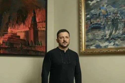 Imagine 25/03/2025 -22:54 News Indignare la Moscova, după ce Zelenski s-a pozat în fața unui tablou ce ilustrează Kremlinul în flăcări