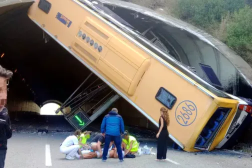 Imagine 16/07/2024 -17:30 News Accident teribil în Spania: Un autocar cu 45 de muncitori s-a răsturnat la intrarea într-un tunel