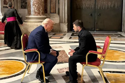 Imagine 26/04/2025 -11:22 News Zelenski s-a întâlnii cu Trump la Roma, în marja funeraliilor Papei Francisc