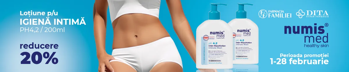 Pentru igiena delicată din această perioadă recomandăm un produs care combină curățarea blândă cu susținerea hidratării și a pH-ului local. NumisMed loțiune intimă pH 4,2 are un pH adaptat zonei intime și conține ingrediente hidratante, concepute pentru a oferi surplusul de hidratare necesar mucoasei vaginale la menopauză — ceea ce o face potrivită pentru îngrijirea cotidiană a femeilor aflate la această etapă a vieții.