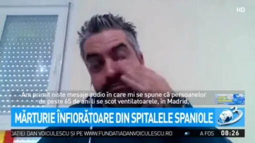 Scenariul sumbru al Italiei pare să fie urmat şi de Spania, unde numărul deceselor de coronavirus a depășit 2.500. Sistemul medical spaniol, aflat pe locul 5 în topul celor mai performante din lume, este în colaps. Un medic plânge în hohote, după ce a fost anunțat că nu mai sunt ventilatoare, astfel că bătrânii trebuie să fie lăsați să moară, pentru a salva viețile celor tineri. Bolnavii nu mai au loc în paturi și sunt așezați pe holuri, în spitalele din Madrid. Atenție, imagini cu puternic impact emoțional!