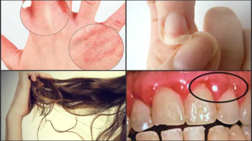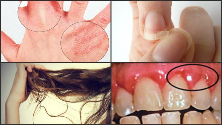 6. Carii dentare - deficienţa de vitamina B6 şi minerale, în special calciu, bor, mangan.7. Sângerarea gingiilor - deficienţa de vitamina C şi bioflavonoide, sau vitamina P.8. Crăpături în colţurile gurii - lipsa elementelor din complexul B sau a riboflavinei.9. Limba umflată - lipsa acidului folic, a vitaminei B12, zincului sau fierului.10. Limba pală, deschisă la culoare - nivel scăzut de fier.11. Cearcăne - nivel scăzut de quercitină sau vitamina C.12. Deformarea unghiilor - deficienţa de fier.13. Inflamarea cuticulelor în jurul unghiilor- deficienţă de zinc.14. Pielea uscată - deficienţa de acizi graşi esenţiali, vitamina A, vitamina E, fier.
