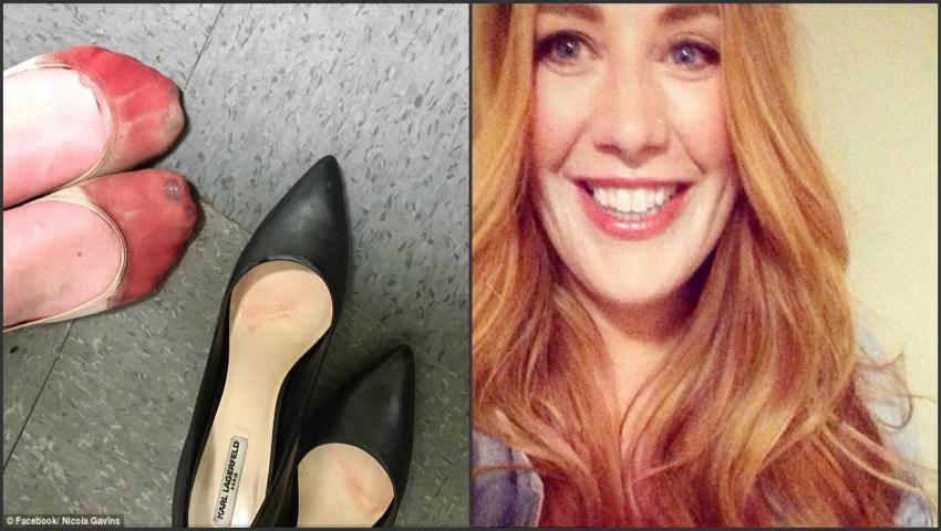 Tânăra, chelner la o reţea de restaurante, arată prietenilor virtuali o fotografie cu picioarele sale sangerânde după ce a muncit în tura ei toată ziua pe tocuri. Mai mult, fata se plânge că deşi avea picioarele lezate şi umflate, şeful său a insistat să încalţe tocuri la locul de muncă chiar în ziua următoare.