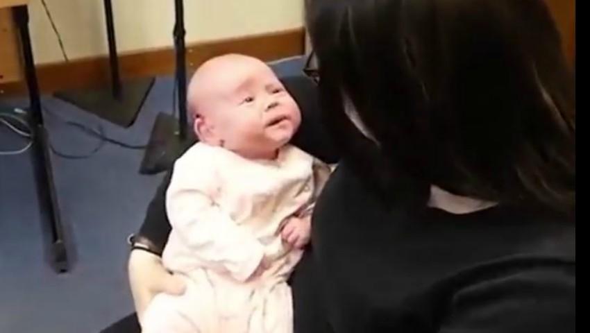 Momentul în care un bebeluș aude pentru prima dată vocea mamei lui, datorită unui nou aparat auditiv, a fost surprins, iar imaginile au devenit virale.