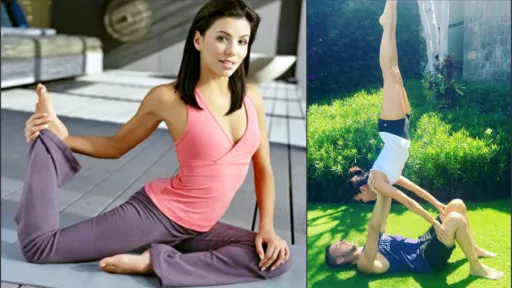 Eva practică exerciţii complexe de yoga cu instructorul personal de sport.