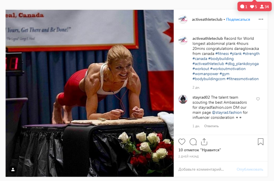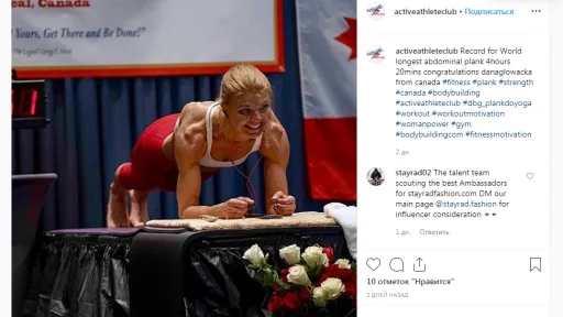 În ultima parte a tentativei sale supraomeneşti, efortul fizic al Danei a fost atât de mare încât a renunţat la telefon şi s-a concentrat scrâşnind din dinţi doar la menţinerea poziţiei corecte a abdomenului. Vechiul record mondial la „planking” era de 3 ore şi 31 de minute, stabilit în 2015 de Maria Kalimera din Cipru. În 2016, la precedenta încercare de a intra în Cartea Recordurilor, Dana Glowacka a cedat după 2 ore şi 5 minute.https://www.youtube.com/watch?v=ZxuMYdBzVdo