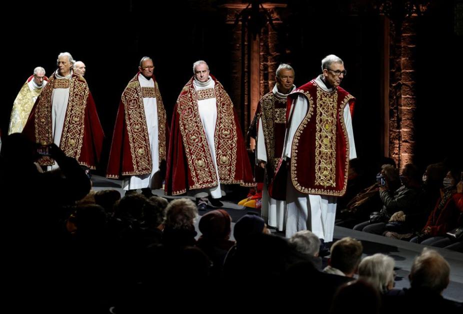 Îmbrăcați în veșminte preoțești elaborate, modelele au pășit pe muzică de orgă în catedrala orașului belgian Tournai, relatează Digi24.