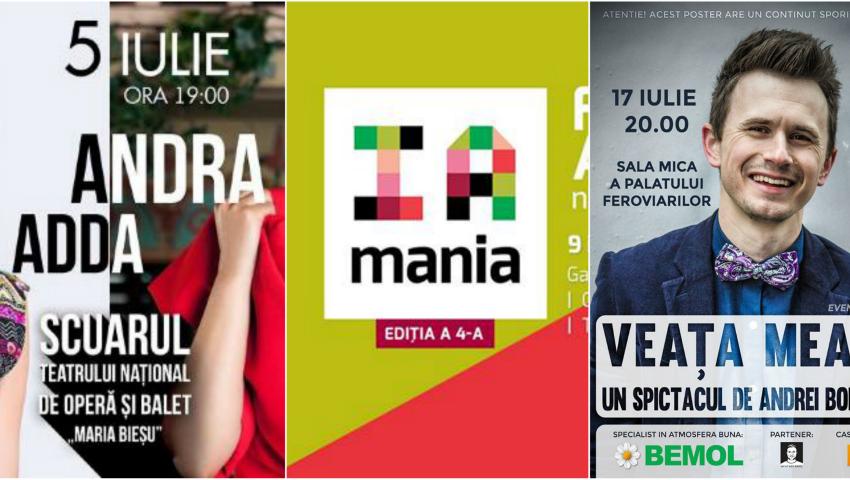 1. În data de 5 iulie – Concert Andra şi Adda, în Orășelul Sportiv din Scuarul Teatrului Național de Operă și Balet “Maria Bieșu” , cu începere de la ora 19:00.Biletele pot fi procurate la casele “Bisconcert” din incinta Teatrului Național de Operă și Balet “Maria Bieșu”, de la orele 10:00 până la 18:00, iar în timpul meciurilor de fotbal, le poţi procura în VIP Zona Orășelului Sportiv. Info 069-81-51-51.2. Pe 7 iulie – Gala stelelor Baletului Vienez la Teatrul National de Opera si Balet Maria Bieșu.Fundația Campionilor Olimpici din Republica Moldova va organiza evenimentul cultural Gala Concert susținut de stelele Baletului Vienez. Spectacolul este o noutate culturală şi oferă invitaţilor șansa de a urmări prestația vedetelor de balet de talie mondială.3. Pe 9 iulie – IA MANIA 2016 în satul Holercani, DubăsariFestivalul artelor născute din tradiții revine pe malul bătrânului Nistru. Îmbracă-te în ie și vino să te umpli de mândrie! Nu ai o ie, vino să-ți cumperi una. La eveniment vei găsi un târg de bucate tradiționale și artizanat autentic, concursul de artă murală „Cai Verzi pe Pereți”, precum și „Mândria” – competiția colecțiilor vestimentare inspirate din tradiții.4. Pe 9 iulie – Festivalul open-air de Cântec FrancezTe invită la a-6-lea Festival în aer liber al cântecului francez din Horodiste, Rezina, ce va avea loc sâmbătă 9 iulie începând cu ora 12:00. Acesta se va desfășura la fel ca și anii trecuți pe terenul viitoarei eco-pensiuni din Horodiște. Va fi un minunat moment de sărbătoare și muzică într-un decor de țară frumos, cu invitaţi din România, Belgia, Franța. De asemenea, în cadrul festivalului, veți avea ocazia să vă delectați papilele gustative cu bucate tradiționale franceze: brânzeturi, clătite, quiche, vin, bere.5. Pe 10 iulie – Transmisiune în direct a Campionatului Euro de FotbalFinala EURO 2016, programată duminică 10 iulie, va fi disputată pe Stade de France din Saint-Denis. Urmărește transmisiunea în directă a Campionatului Euro 2016, în scuarul Teatrului de Operă și Balet.6. Pe 15-16 iulie – Târgul Universităților din România pe Aleea Clasicilor din ChișinăuTârgul Universitățior din România, parte a campaniei Admite.ro a FAB România va avea loc și în acest an la în perioada 15-16 iulie la Chișinău, 17 iulie la Bălți și 18 iulie la Cahul. La târg vor participa voluntari ai asociațiilor de basarabeni din România studenți din principalele centre universitare românești din circa 15 orașe. Dacă ești interesat de studiilor în România ai șansa să afli mai multe în cadrul acestor târguri. Voluntarii FAB România vă așteptă7. În data de 16 iulie – Cucuteni Festival 2016 la IvanceaCulorile naturii, spiritul antichității, arta ceramicii, libertatea de exprimare, toate la Cucuteni Festival 2016. Aflat la cea de-a doua ediție în acest an, vă așteaptă cu peste 70 de picturi și obiecte din ceramică reproduse după cultura Cucuteni-Tripolie. În program, bucate și băuturi preparate după cele mai vechi rețete;săpături arheologice adevărate pentru copii; master-classuri dedicate artei culturii Cucuteni – Tripolie; spectacol al focului; muzica instrumentelor străvechi; art sale; reînvierea ritualurilor antice. Intrarea la festival este gratuită.8. Pe 17 iulie – Ghidighici Sea Mile 2016Sea Mile este competiţie de înot în apă deschisă pe lacul Ghidighici. În 2016 cursa grandioasă de înot în apropierea Chişinăului va avea loc deja a patra oară. Distanţe: Fun Swim (200 metri), Sea Mile (1852 metri), Double Sea Mile (3704 metri).9. În data de 17 iulie – VEATA MEA!!1 la Palatul de Cultură al FeroviarilorProducătorul Emisiunii “Lumina”, Andrei Bolocan, te invită la un seminar motivațional de business și leadership – VEAȚA MEA!!1. Glume haioase, informații interesante și cuvinte necenzurate în limba franceză? Vino cu întreaga familie (mai ales dacă ai peste 16 ani)! Îmbracă-te în ceva scump, dar nu la fel de scump ca Valerian Mînzat și intră în lumea de vis a bancurilor umoristice și hazlii. Hahaha, o sa fibă vesel tare!Lista completă a evenimentelor o poţi vedea aici.sursa: www.diez.md