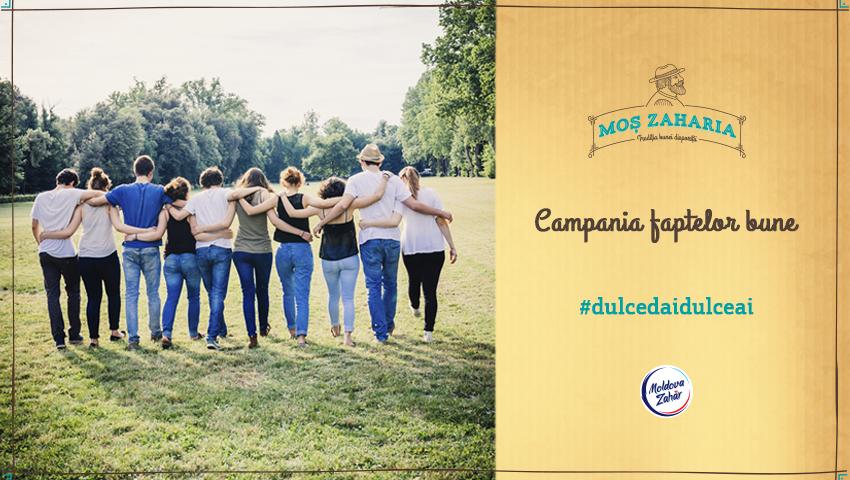 Moșul Zaharia are și el un suflet dulce. Ar vrea să ajute cât mai multă lume, dar nu are atâtea mâini și picioare.Haideți să-i dăm o mână de ajutor. Toată lumea este invitată să participe în campania de îndulcire a sufletelor #dulcedaidulceai.Că să meargă lucrurile, sunt niște pași de urmat:1. Fă o faptă bună. Îndulcește ziua și sufletul cuiva.2. Încarcă poza cu marea îndulcire pe facebook folosind hashtagul #dulcedaidulceai3. Îndeamnă prietenii să-ți urmeze exemplul.În caz că ești în pană de idei cum ai putea contribui, venim cu niște sugestii. Ai putea da mai departea buna dispoziție cu:-un gest frumos făcut pentru ai tăi;- un cadou surpriză făcut colegilor;- un ajutor pentru cineva necunoscut;- un buchet de flori dăruit la întâmplare;- un prânz oferit unui cerșetor;- o conversație în parc cu un om singuratic;- un video cu un muzician ce cântă în plină stradă;- o multitudine de alte posibilități de a îndulci sufletul cuiva;Să dăm sfoară-n țară ca să afle cât mai multă lume. Să îndulcim țara asta în lung și-n lat!Detalii pe www.moszaharia.md și facebook.com/MosZaharia/.https://www.youtube.com/watch?v=suEhDh5afJwZahărul „Moș Zaharia” este un produs al ICS “Moldova-Zahăr” SRL, confecționat din sfeclă de zahăr cultivată sută la sută în Moldova.Compania a fost achiziționată în mai 2011 de “Krajowa Spółka Cukrowa” S.A. - Asociația poloneză a producătorilor de zahăr. Compania nu doar că a reușit să revitalizeze fabrica practic distrusă, ci și să modernizeze cele mai bune tradiții moldovenești de producere.