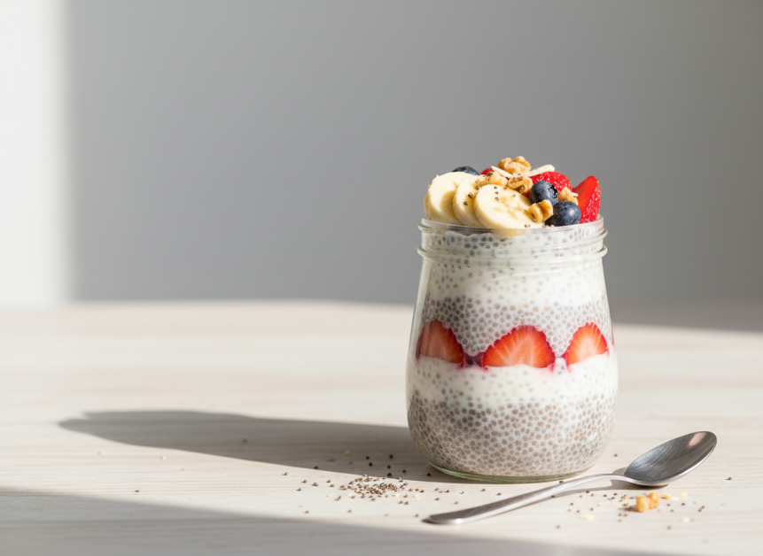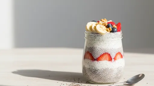 Acoperă bolul și lasă-l la frigider timp de cel puțin 2 ore sau peste noapte, până semințele absorb lichidul și se formează o textură cremoasă, de budincă. - Servește cu fructe:
