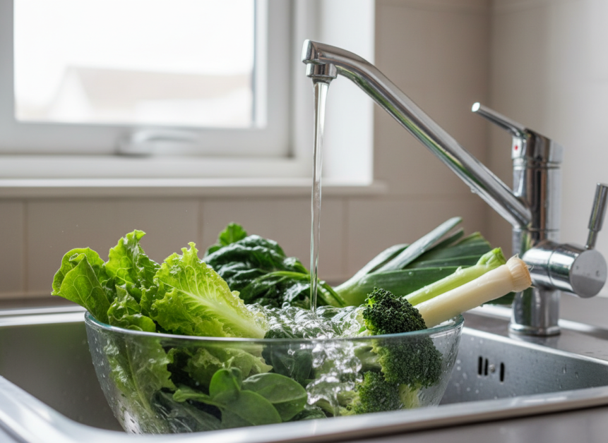 - Legume verzi (salată, spanac, praz, broccoli): Îndepărtează straturile exterioare, apoi lasă-le câteva minute într-un bol cu apă rece și scurge-le bine înainte de consum.