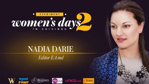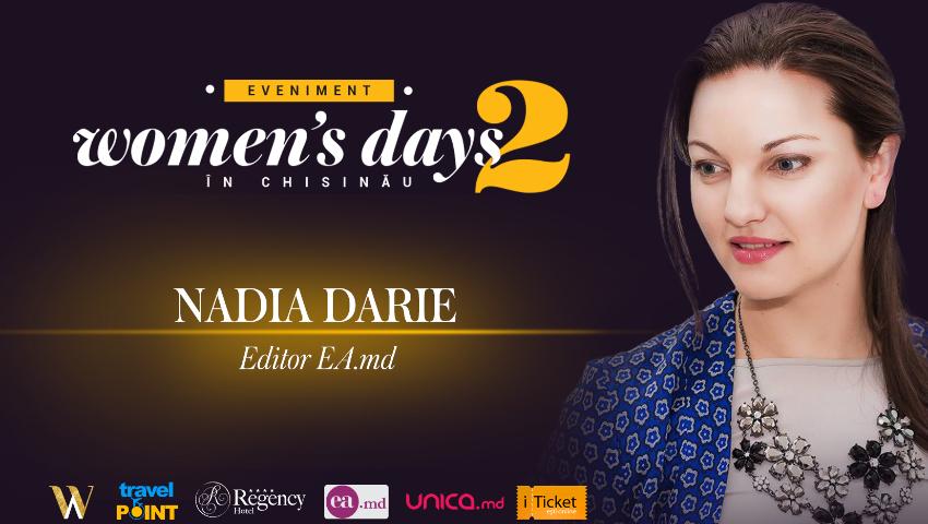 Detalii despre ediția a II-a: O nouă ediție „WOMEN’S DAYS in CHIȘINĂU”. Vino să regăsești, să reinventezi și să valorifici Femeia din tine!În adolescență a cochetat cu scrierea versurilor, fiind premiată în repetate rânduri. În 2011, Nadia semnează versurile pentru două piese ale duetului Costi Burlacu și Corina Țepeș: „Dimineața” și „Spune-mi cine ești”. Orice își propune să facă, o duce la bun sfârșit cu multă creativitate și originalitate.Dacă dorești sa afli cum e să fii „FEMEIA” care transmite pentru fiecare dintre noi zâmbet și gânduri pozitive, sau să afli cum poți să reușești să fii mama, soție, editor și manager de proiecte, vino să petreci timpul cu noi la „Women’s Days in Chișinău” pe data de 25-26 februarie, orele 11.00-15.00.Abonati-va cu un LIKE la pagina noastra de facebook, pentru a fi la curent cu ultimele noutati: https://www.facebook.com/womenadventuremoldova/…Vă invităm să vă redescoperiți, pentru că iubim femeia din noi. LOCURILE SUNT LIMITATE!Biletele se pot procura pe adresa Iu. Gagarin 3 sau la nr. de tel. 076004200, 067466699 sau pe: https://iticket.md/e…/womens-days-in-chisinau-a-ii-a-editie/ sau http://events.travelpoint.md/Autor: Tatiana Ganziuc
