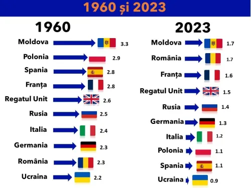 În anii 1960, Republica Moldova se situa printre țările cu cele mai ridicate rate ale fertilității, depășind Polonia (2,9), Spania și Franța (2,8), Regatul Unit (2,6) și Germania (2,3). Astăzi, Moldova și România au valori similare, de 1,7 copii per femeie, iar Franța și Regatul Unit înregistrează 1,6, respectiv 1,5 copii.