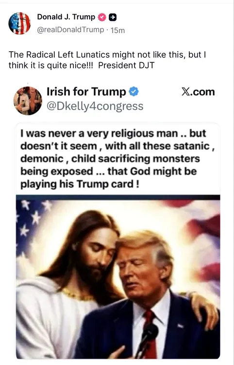 Președintele Statelor Unite, Donald Trump, a publicat pe Truth Social o nouă imagine generată cu ajutorul inteligenței artificiale, în care apare îmbrățișat de Iisus Hristos. Imaginea, preluată de la un utilizator și redistribuită de liderul american, îl arată pe Trump cu ochii închiși, sprijinindu-și tâmpla de Iisus, în fața unui microfon, cu steagul american în fundal. Postarea originală sugera că „Dumnezeu ar putea să-și joace cartea Trump” în contextul unor presupuse amenințări „demonice”.