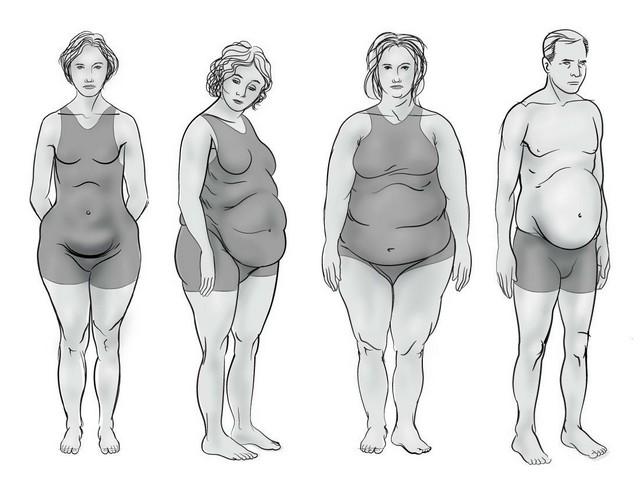 - Grăsime pe șolduri și fese, „burtă de bere”, umeri înguști