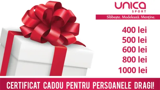 Ce ar putea fi mai plăcut pentru o femeie decât să primească în dar sănătate și frumusețe? Unica Sport îți oferă șansa să cumperi Certificate Cadou în valoare de 400, 500, 600, 800 sau 1000 de lei.Acest cadou unic este perfect atât pentru femeile dragi, cât și pentru angajatele tale, deoarece astfel ele vor ajunge la o condiție fizică bună și vor obține o transformare estetică completă.Primind acest certificat în dar, femeia poate beneficia de următoarele servicii de la Unica Sport:- Antrenamente UNICA de modelare corporală;- Antrenamente individuale;- Antrenamente pentru însărcinate;- Antrenamente în tempo lent;- Servicii de masaj (terapeutic, modelator, anticelulitic, vacuum);- Testare nutrițională și fiziologică (Regim alimentar personalizat);- Servicii cosmetice faciale și corporale (depilare cu ceară, electroepilare, manichiură, pedichiură etc.)- Abordare individuală și monitorizare a rezultatelor;Timp de aproape 20 de ani, zeci de mii de femei au devenit ambasadoarele modului sănătos de viață cu Unica Sport. Datorită antrenamentelor cu efort fizic dozat după metoda UNICA acum sunt mai încrezătoare, mai motivate și mai fericite! Doritorii pot procura Certificatul Cadou în orice filială Unica Sport.Date de contact: 060 451 122